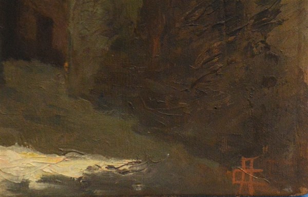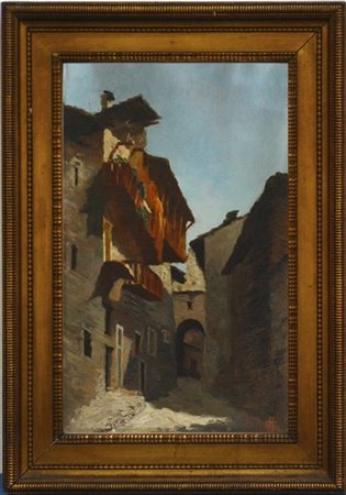 Ignoto "Paese di montagna" olio su tavola (cm 40x25) Siglato in basso a destra. In cornice
