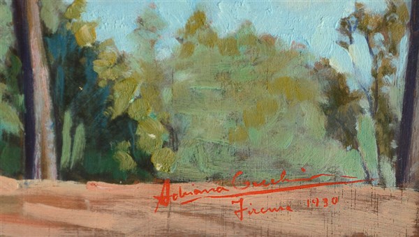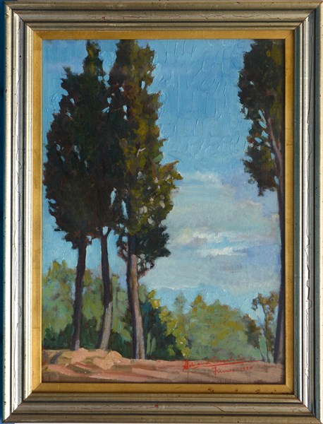 Firma indecifrata "Alberi" olio su compensato (cm 37x26) Firmato, locato e datato in basso a destra Firenze 1930, in cornice