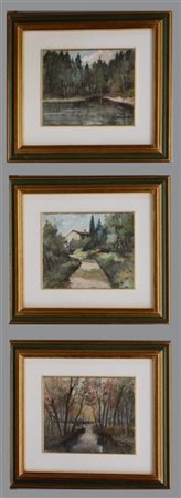 G. Manfredini "Paesaggi" gruppo di tre dipinti ad olio su cartone telato (cm 20x