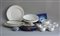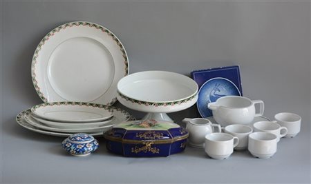 Manifatture diverse, lotto composto da scatola con coperchio, un piattino Copenaghen, un piatto tondo, cinque piatti ovali, un alzatina, due lattiere e cinque tazzine in ceramica e porcellana (difetti)