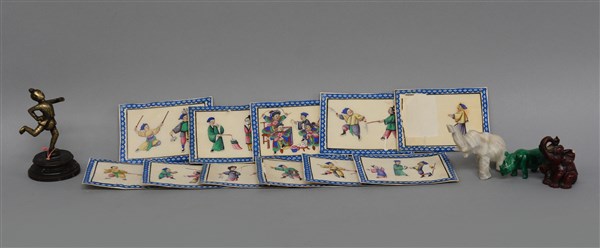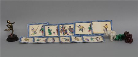 Manifattura orientale, lotto composto da undici piccole tessere in carta di riso raffiguranti personaggi, una figura di divinità, tre animali ed un pannello di gusto etnico di diversi materiali (difetti)