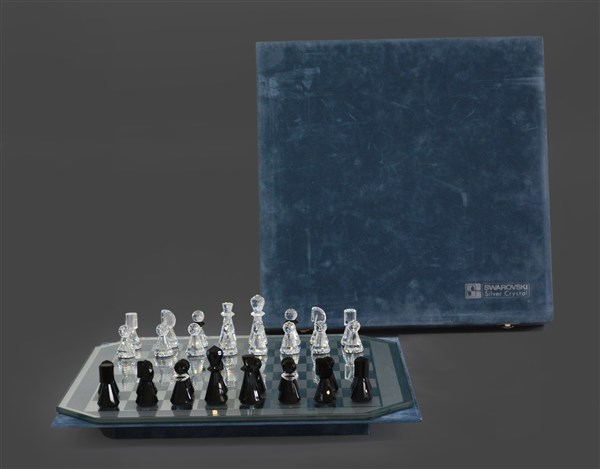 Swarovski, gioco degli scacchi in cristallo con scacchiera a specchio, in custodia originale