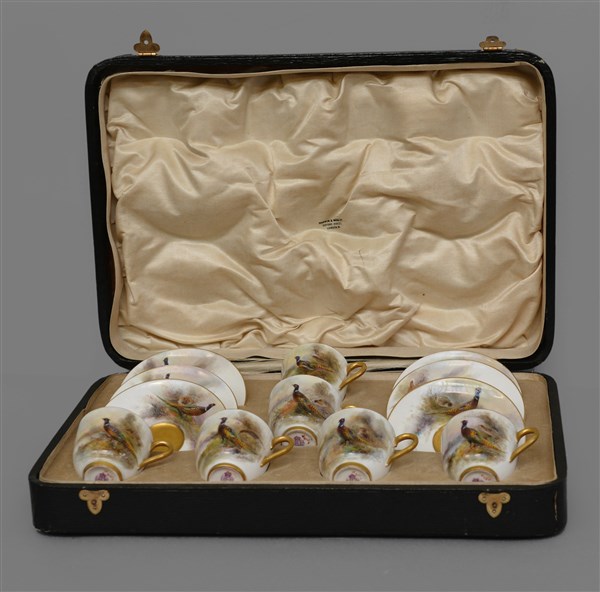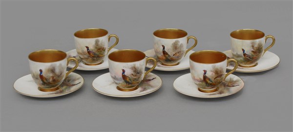 Manifattura Inglese, Royal Worcester, gruppo di sei tazzine con piattini in porcellana decorata in policromia con volatili in un paesaggio, profili dorati, contenute in custodia Mappin & Webb (difetti)