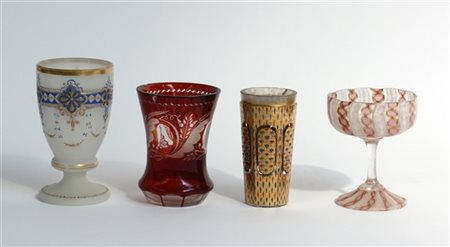 Lotto di quattro bicchieri in vetro di fatture differenti.
