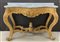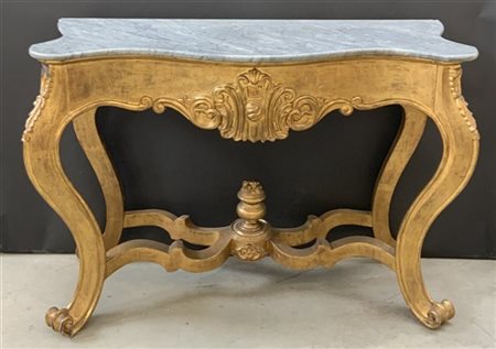 Console di forma sagomata in legno intagliato e dorato. Grande fregio a volute al centro della fascia sottopiano. Gambe a sagoma terminanti a ricciolo. Crociera analoga con al centro elemento decorativo tornito. Piano in marmo , secolo XIX (cm 133x95x52) (difetti e restauri)