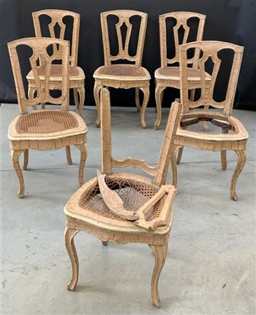 Gruppo di sei antiche sedie con schienale a giorno curvilineo e fregio centrale, quattro gambe mosse (difetti, rotture e mancanze)