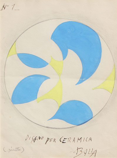 Giacomo BALLA Torino 1871 - Roma 1958 Disegno per ceramica, 1916 Tempera su carta cm 27 X 20 Autentica di Elena Gigli su fotografia Bibliografia M. Donà ‘Futurismo e Aereopittura. Velocità e dinamismo dal Trentino alla Sicilia’, galleria Arte Centro, 2009, p. 21; C.Cerutti, R.Sgubin ‘Futurismo Moda Design’, Borgo Castello, Gorizia, 2010, p. 150 Titolo, firma ‘Disegno per ceramica, Balla’ (in basso) Etichetta e timbro galleria Arte Centro, Milano; etichetta Rose Fried gallery, New York (al retro)