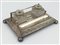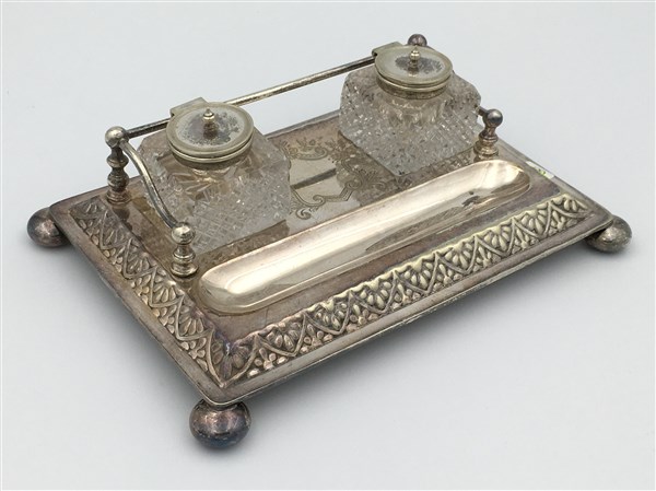 Piccolo calamaio da scrivania in metallo argentato con due boccette da inchiostro in vetro (lievi difetti)