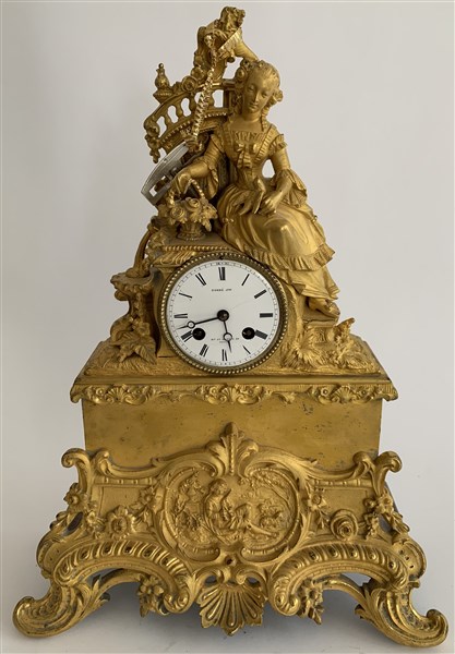 DOBBÉ Orologio in bronzo dorato con scena galante. Francia Terzo quarto XIX Sec