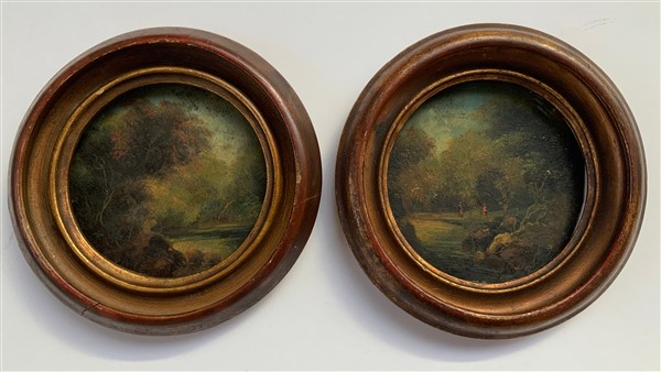 Coppia di piccoli dipinti ad olio su rame di forma tonda raffiguranti "Pasaggio" e "Paesaggio con figure" (d cm 10) in cornici (difetti)