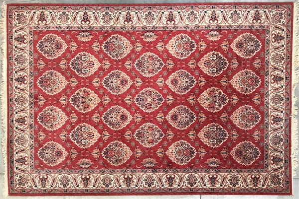 Tappeto meccanico, secolo XX. Decoro con piccoli medaglioni floreali su fondo rosso (cm 301x200) (Lievi difetti)