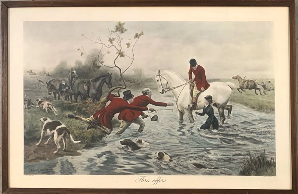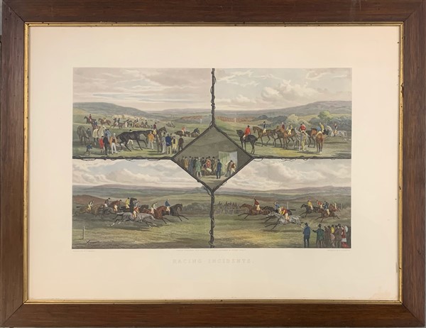 Lotto di tre stampe inglesi a colori a soggetto ippico (cm max 52x81) in cornici (difetti)