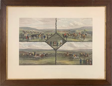 Lotto di tre stampe inglesi a colori a soggetto ippico (cm max 52x81) in cornic