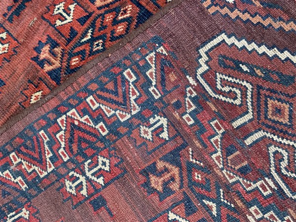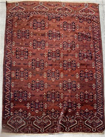 Tappeto Yomut, Turkestan occidentale, fine secolo XIX. Decoro con Gül stilizzati nei toni del bianco, albicocca, rosso e blu su campo color bordeaux. (Difetti, rapature e vecchi restauri)(cm 190x133)