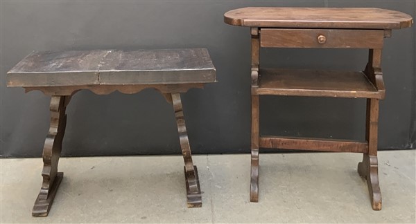 Lotto composto da un tavolino in legno con gambe ad asso di coppe e un tavolino con cassetto (difetti)