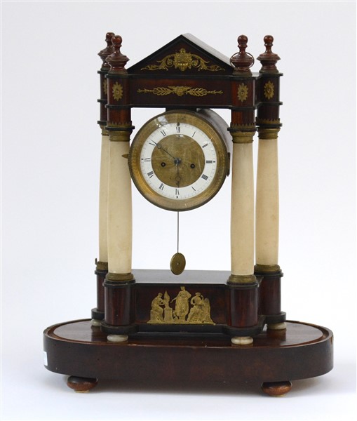 Orologio a portico in legno, bronzi dorati e alabastro.