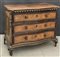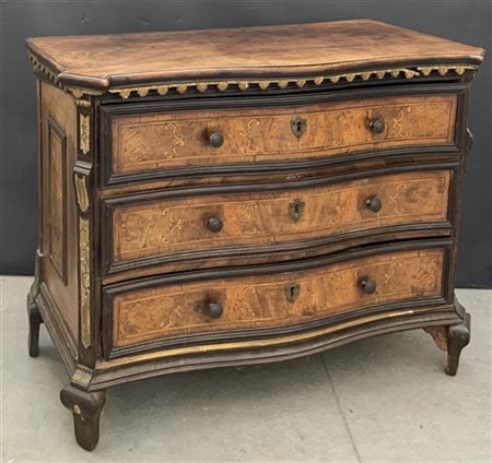 Comò con fronte mosso a tre cassetti intarsiati e filettati in legno chiaro, montanti e profili ebanizzati. grembiale intagliato e dorato a foglie. Piedi mossi, Lombardia secolo XVIII (cm 116x93x53) (difetti e restauri)