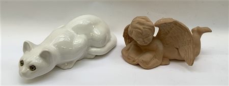 Lotto composto da una scultura in ceramica bianca raffiigurante un gatto ed una scultura in terracotta raffigurante un angelo che legge (l max cm 36) (difetti)