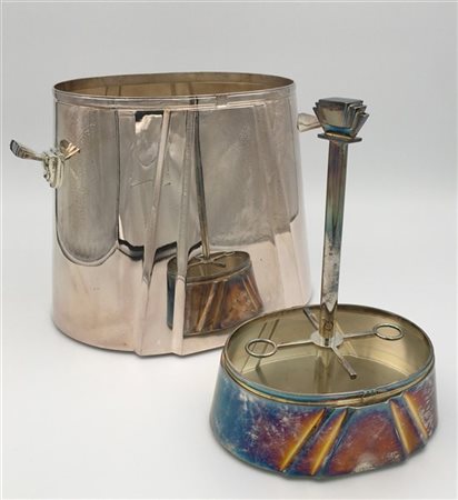 Parte di servizio da tavola stile decò in argento composto da un cruet di forma ovoidale e presa a corona e un secchiello portaghiaccio scanalato. Titolo 800, Alessandria. Argentiere A. Cesa S.C. (g 2750) (mancanze)