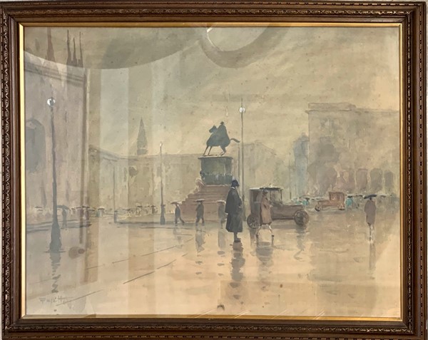 "Piazza del Duomo a Milano" acquarello su carta (cm 32x53) firmato in basso a sinistra. Iscrizione al retro del perito Luigi Castelfranchi. In cornice