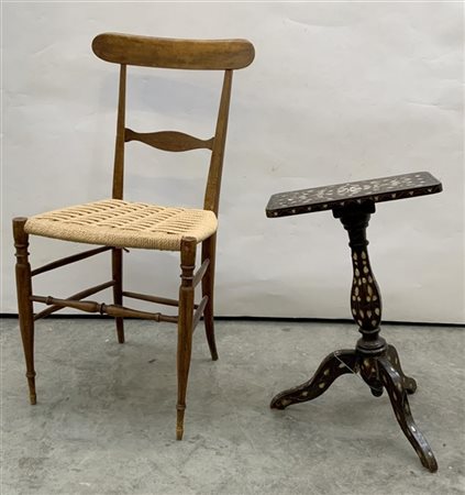 Lotto composto da un tavolino tripode in legno con intarsi in madreperla a motivi floreali (cm 35x57x21) ed una sedia "chiavarina" (difetti e mancanze)