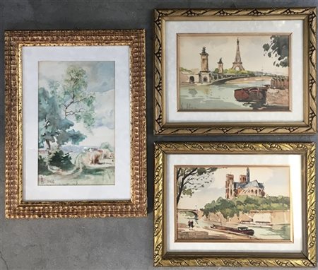 Lotto composto da una coppia di acquerelli con "Scorci parigini " firmati H. Alexis (cm 13x20) e un acquerello raffigurante "Paesaggio agreste" siglato e datato L. E. 1906 (cm 21x13), in cornici