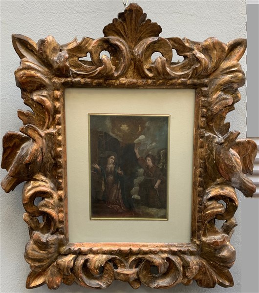 Scuola della fine del secolo XVII-inizio XVIII "Annunciazione" olio su rame (cm 22x17). In cornice intagliata e dorata