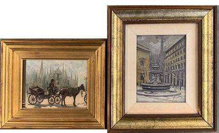 Lotto di due dipinti ad olio su cartone telato raffiguranti "Vecchia Milano" (cm 15x20) Firmati in basso a destra. In cornici