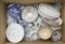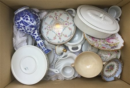 Cartone contenente parti di servizio da tavola di diversa forma, uso e manifattura in ceramica e porcellana policroma e altri oggetti di diverso materiale (difetti)