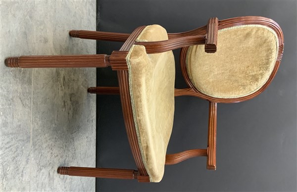 Tavolo rettangolare con gambe e fasce scanalate (cm 140x76x99) unito ad una poltroncina di identica fattura (difetti e restauri)