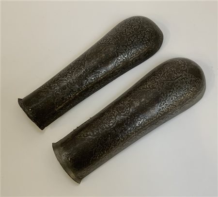 Coppia di bazu-band, protezioni per l'avambraccio, in ferro con incisioni di carattere floreale e con tracce di agemine in oro. Provenienza Indo-persiana, metà secolo XIX (h. cm 31) (lievi difetti)