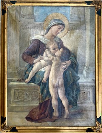 L. Mottironi "Madonna con Bambino e San Giovannino" copia da León Bazile Perrault ( 1832 - 1908) olio su tela (cm 90x65) Firmato al verso. In cornice