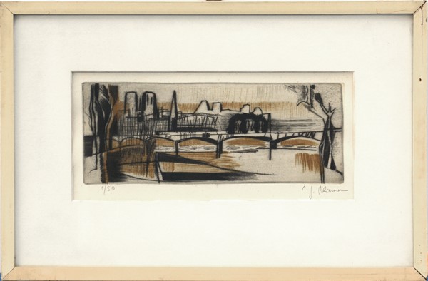 Firma indecifrata "Paesaggio con ponte" acquaforte a colori lastra cm 9,5x24 fi