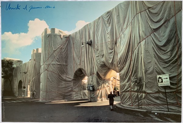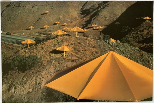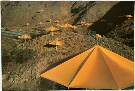 Lotto composto da due manifesti firmati da Christo e Jeanne-Claude rispettivamente "Wrapped Roman Wall" e "The Umbrellas, Japan, U.S.A."
