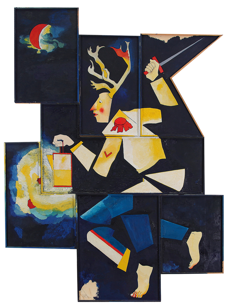 ALDO SPOLDI Crema 1950 Le avventure di Gordon Pim, 1981 olio su assemblaggio di masonite e legno cm. 152x110, firma e titolo in basso, etichetta e firma per autenticità e provenienza dello Studio Marconi (MI) su foto, opera priva di cornice.