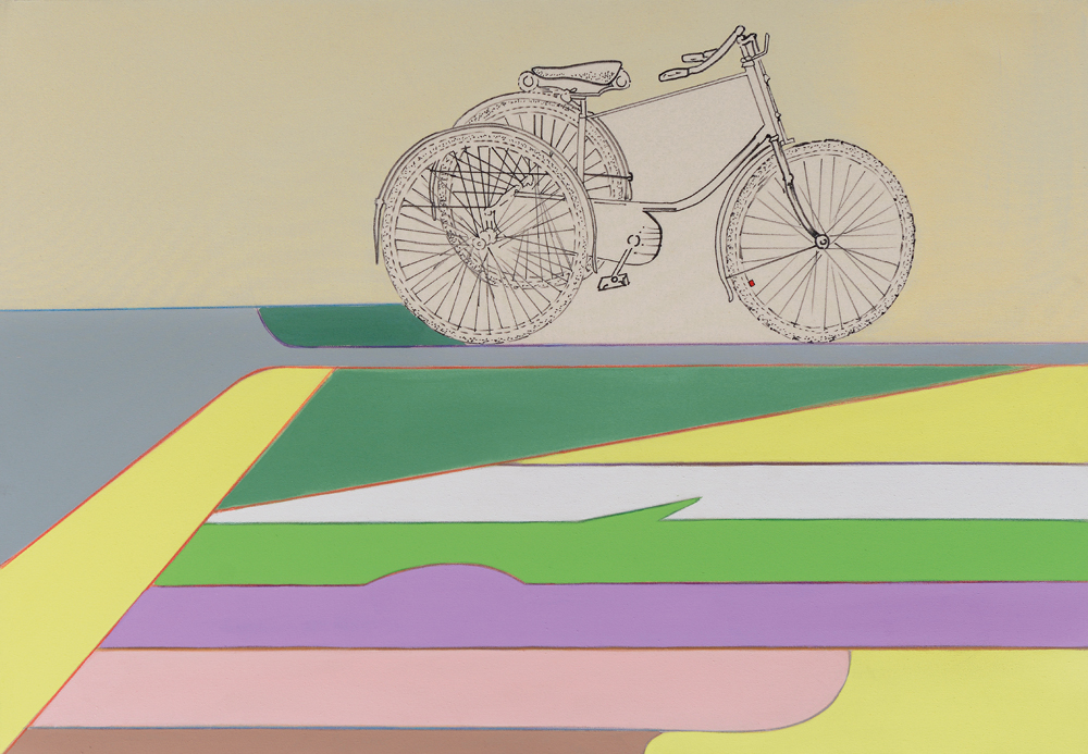 RENATO MAMBOR Roma 04/12/1936 Triciclo dalla valvola rossa, 2008 olio su tela cm. 70x100, firma, titolo e anno al retro, dichiarazione d'autenticità dell'artista su foto, opera priva di cornice.