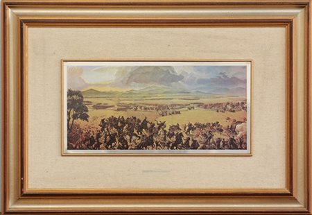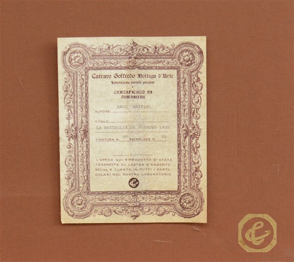 Amos Nattini, stampa a colori su lastra di argento edizione 81/99 raffigurante la Battaglia di Fornovo del 1495. Al retro certificato di garanzia (cm 23x47)