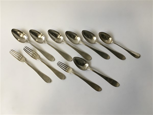 Lotto composto da tre forchette e sei cucchiai in argento, di cui uno in metallo argentato. Punzoni di Milano del secolo XIX (g 500)