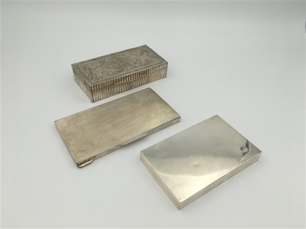 Lotto composto da tre scatole portasigarette di diversa epoca e decoro in argen