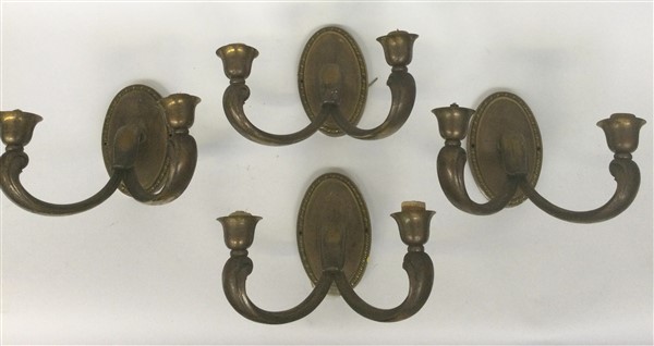 Gruppo di quattro appliques a due luci in bronzo con bracci sagomati. Anni '40/'50. (gravi difetti)