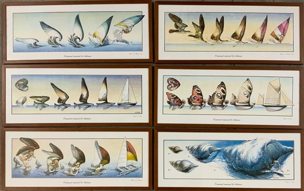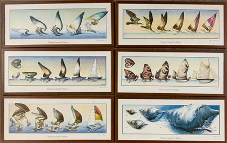 Gruppo di sei stampe a colori di soggetti differenti (cm 25x63), in cornici (li
