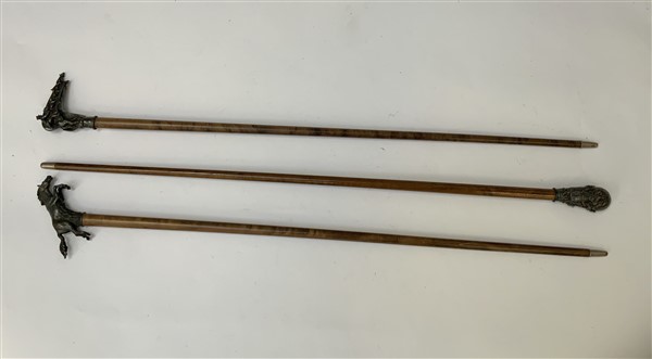 Gruppo di tre bastoni da passeggio con pomelli in lamina d'argento a soggetto s