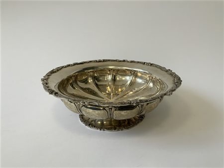 Ciotola in argento con vasca scanalata, tesa e base decorate a volute. Titolo 800. Argentiere Genazzi? (cm 22x7,7) (gr 480 ca)