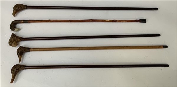 Gruppo di cinque bastoni da passeggio con pomelli in resina sintetica a soggetto ornitologico (difetti)