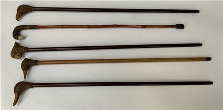 Gruppo di cinque bastoni da passeggio con pomelli in resina sintetica a soggett