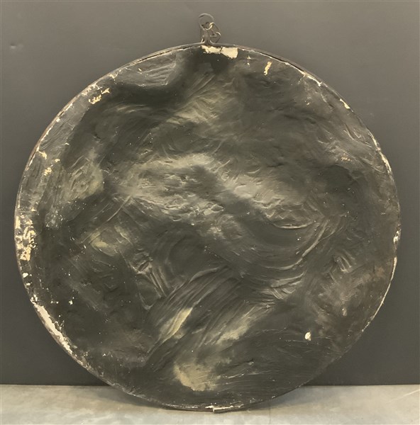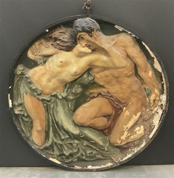 Ignoto "Adamo ed Eva" altorilievo policromo tondo in gesso (d cm 100), firmato in basso a destra. In cornice (difetti, rotture e mancanze)
