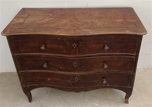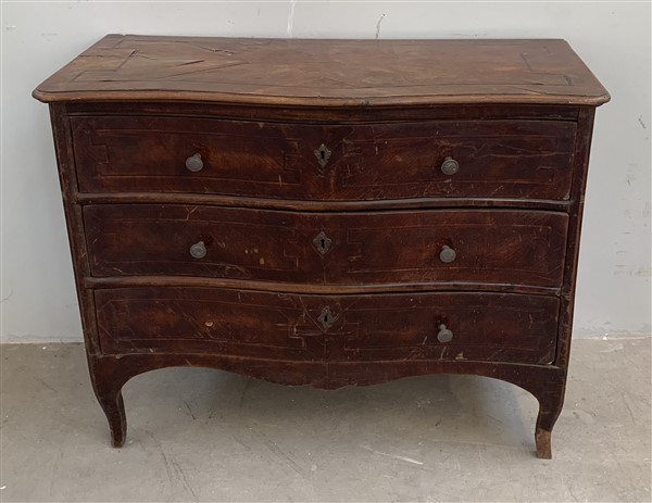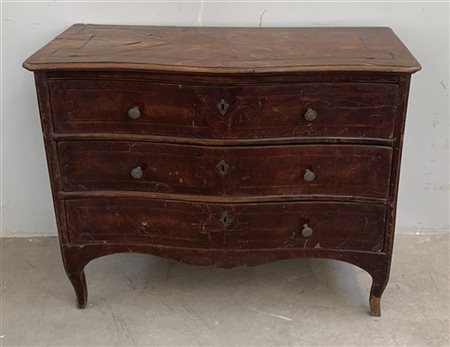 Cassettone lastronato con piano a fronte mosso a tre cassetti filettati. Grembiale e gambe mosse, sec. XVIII (cm 107x87x46) (difetti e restauri)
