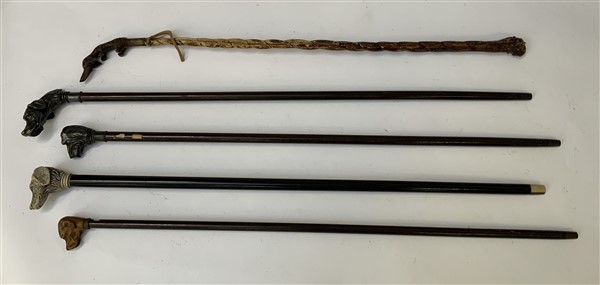Gruppo di cinque bastoni da passeggio con pomelli a soggetto canino di material