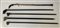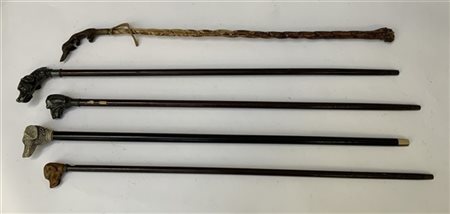 Gruppo di cinque bastoni da passeggio con pomelli a soggetto canino di materiali differrenti di cui due in lamina d'argento (difetti)