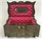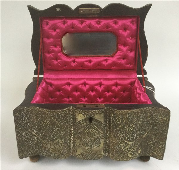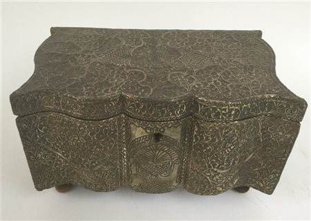 Porta gioie da viaggio di forma mossa in legno rivestito in lamina di argento sbalzato e cesellato a girali vegetali e riserve fiorite, motivi arabeggianti e volatili. Piedi a trottola in legno. Interno imbottito in tessuto trapuntato. Medio Oriente fine secolo XIX (cm 41x22,5x23,5) (difetti e restauri)